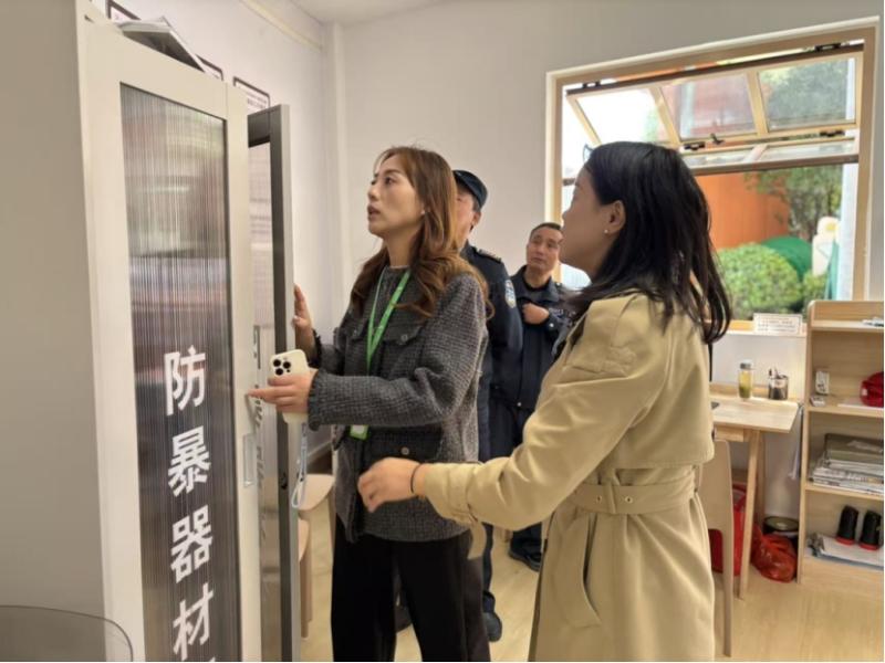 在盛梅菊副园长的陪同下,督学重点查看了各楼层消防栓的开关灵活性、水压稳定性,逐具核对灭火器的生产日期、有效期,确保消防设备能在紧急情况下快速启用;同时,对门卫室及周边安保设施设备进行全面排查,仔细检查监控设备的运行状态与画面清晰度,确认摄像头覆盖范围是否无死角,查看一键报警装置的响应灵敏度与连线稳定性,核验防暴盾牌、钢叉、橡胶棍等防暴器材的数量、存放位置及完好度,为幼儿入园离园筑牢 “第一道安全防线”。