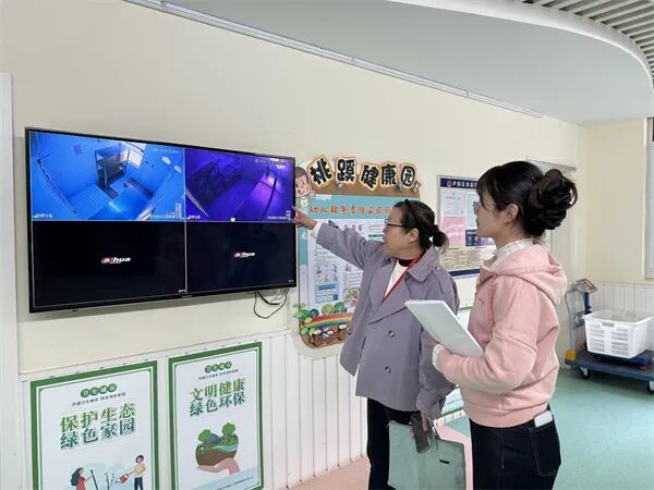 在桃蹊分园执行负责陶园园主任的陪同下,刘彩虹督学首先细致查看了“明厨亮灶”系统的运行状况。通过对监控画面、设备运行记录的仔细检查,刘督学对幼儿园食品安全管理的规范化、透明化举措给予了充分肯定,并强调食品安全是幼儿园工作的重中之重,要持续利用现代化手段筑牢食品安全防线,确保每一位幼儿的饮食安全。随后,刘督学深入园所各个角落,对室内设施安全进行了全面检查,从室内走廊到户外场地,刘督学仔细查看每一处细节,对园所安全工作的扎实细致表示认可。