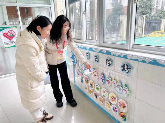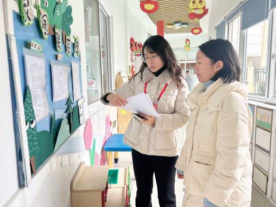 在常规教育教学检查中,董主任观摩了户外活动、教学活动、区域游戏等环节,同时深入班级,仔细查看了教学计划、备课笔记、幼儿晨午检等资料。 来到走廊,董主任对园区环创布置中主题墙新年氛围浓郁,季节主题鲜明且富有童趣给予赞赏,同时针对教学活动设计的细节优化、区域材料的层次性投放等方面提出了指导性建议,要求教师持续提升教育教学质量,促进幼儿全面发展。