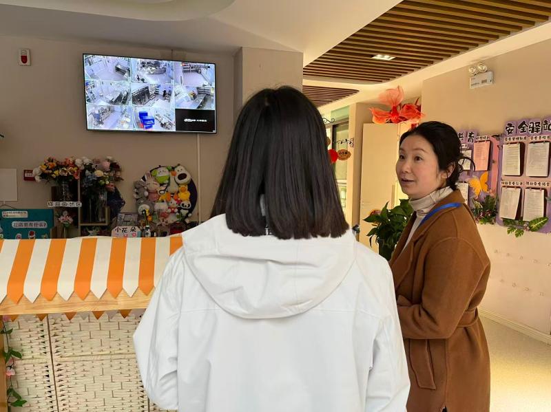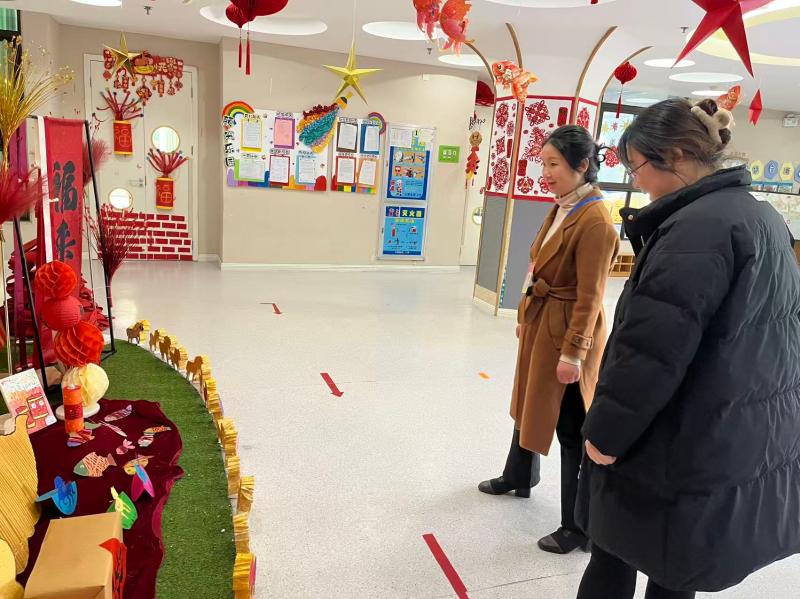 随后,督学实地查看园所环境创设与日常活动开展情况。从走廊里充满童趣的幼儿作品展示,到班级中井然有序的保教活动,每一处细节都彰显着园所为幼儿精心打造的温馨成长空间。看到大厅门口洋溢着新年气息的教师环创作品时,督学更是给予了高度表扬,称赞其兼具审美价值与教育意义。